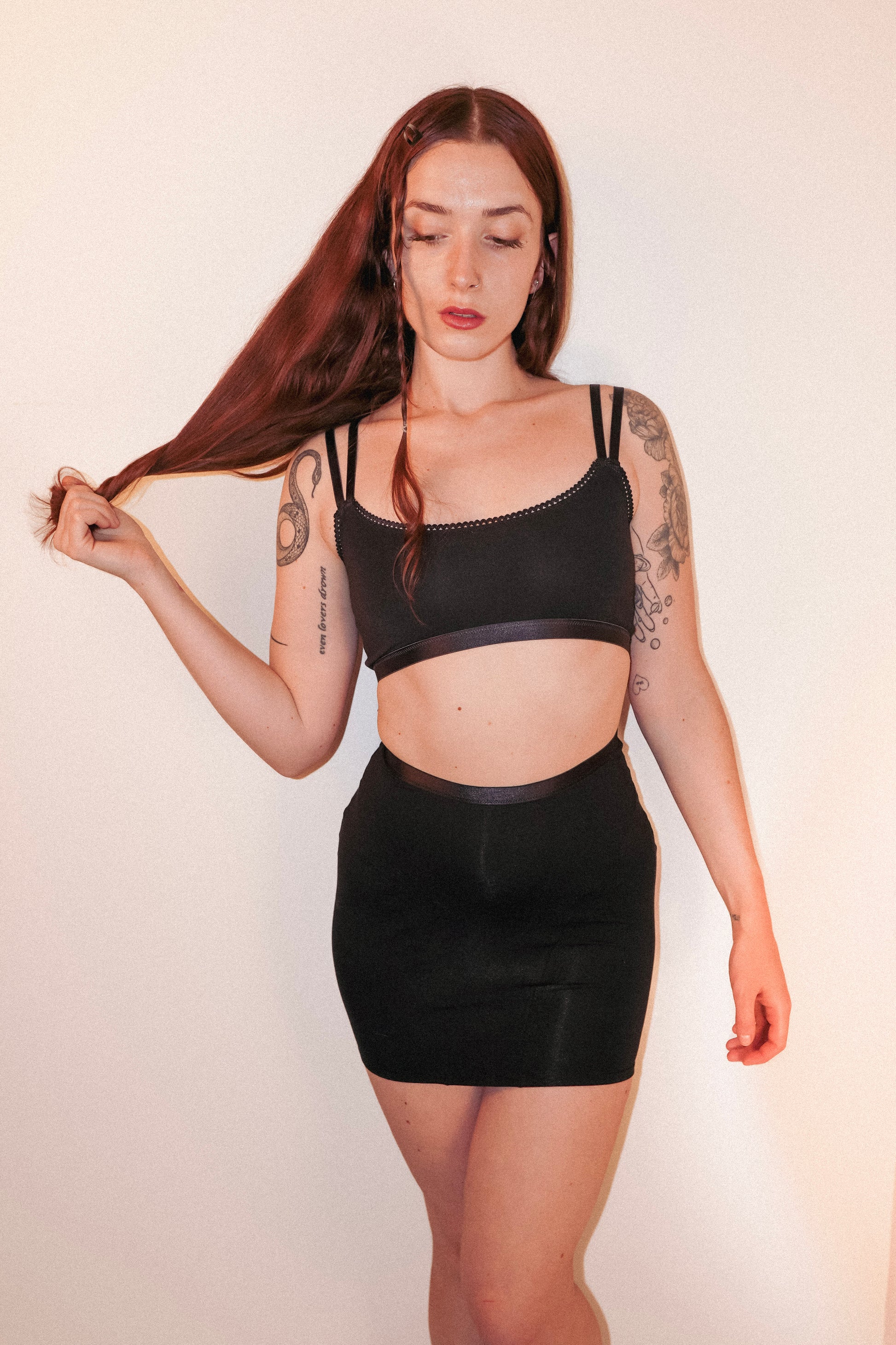 When designing Brigitte, all I knew was I wanted to make a wide band, scoop neck bralette with double bra straps. Then I realized I didn't have a natural matching top to go with the Holloway skirt, and so it evolved. You can choose between bamboo knit or mesh, which is attached to a 3/4" satin elastic band that hooks in the back. The front of the bra is seamless for comfort and support, and attaches to a smaller piece in the back that stays connected with two 3/4" adjustable straps and 1" o-rings that mimic the open back of the Holloway. She's a sexy, stable, and unique choice for your bra drawer. She makes a set with the Holloway skirt.