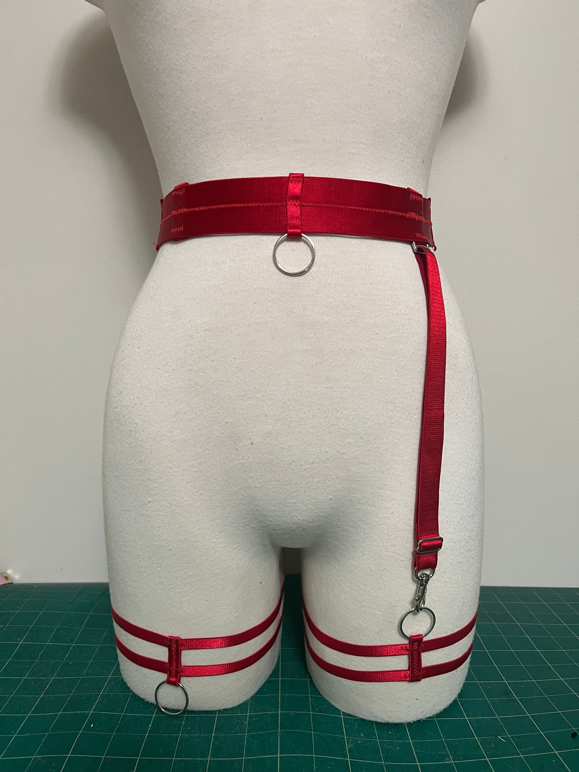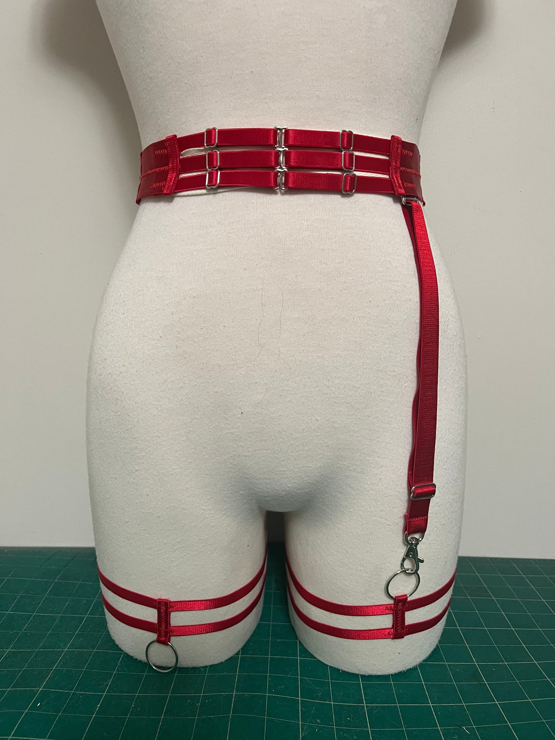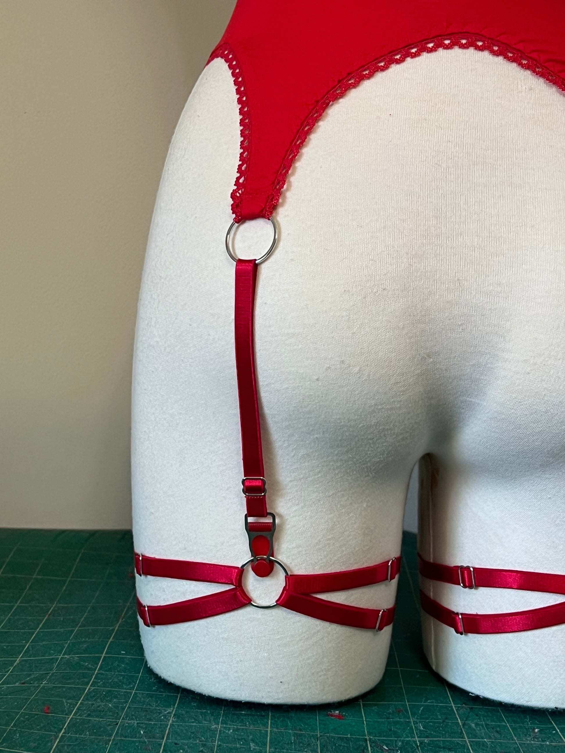 The first born of the new Lara harness range and maybe the most multipurpose! I'd been wanting to make fun, "bondage light" elastic cuffs for years now but never got around to it. I realized there are girls out there who either don't own stockings or don't intent to, but still want to wear styles like the Lilith or Zelda merrywidows that have garter clips. You can technically wear them over stockings for more support, but they look just as sexy on their own. They can also be used like thigh cuffs, and when paired with any of the other cuffs and connector straps in the Lara range they make for the perfect, easy, low commitment bedroom accessories. Offered in eight colors and can be worn in three different ways, as shown in the photo slides. There are two size options but they're always fully adjustable.