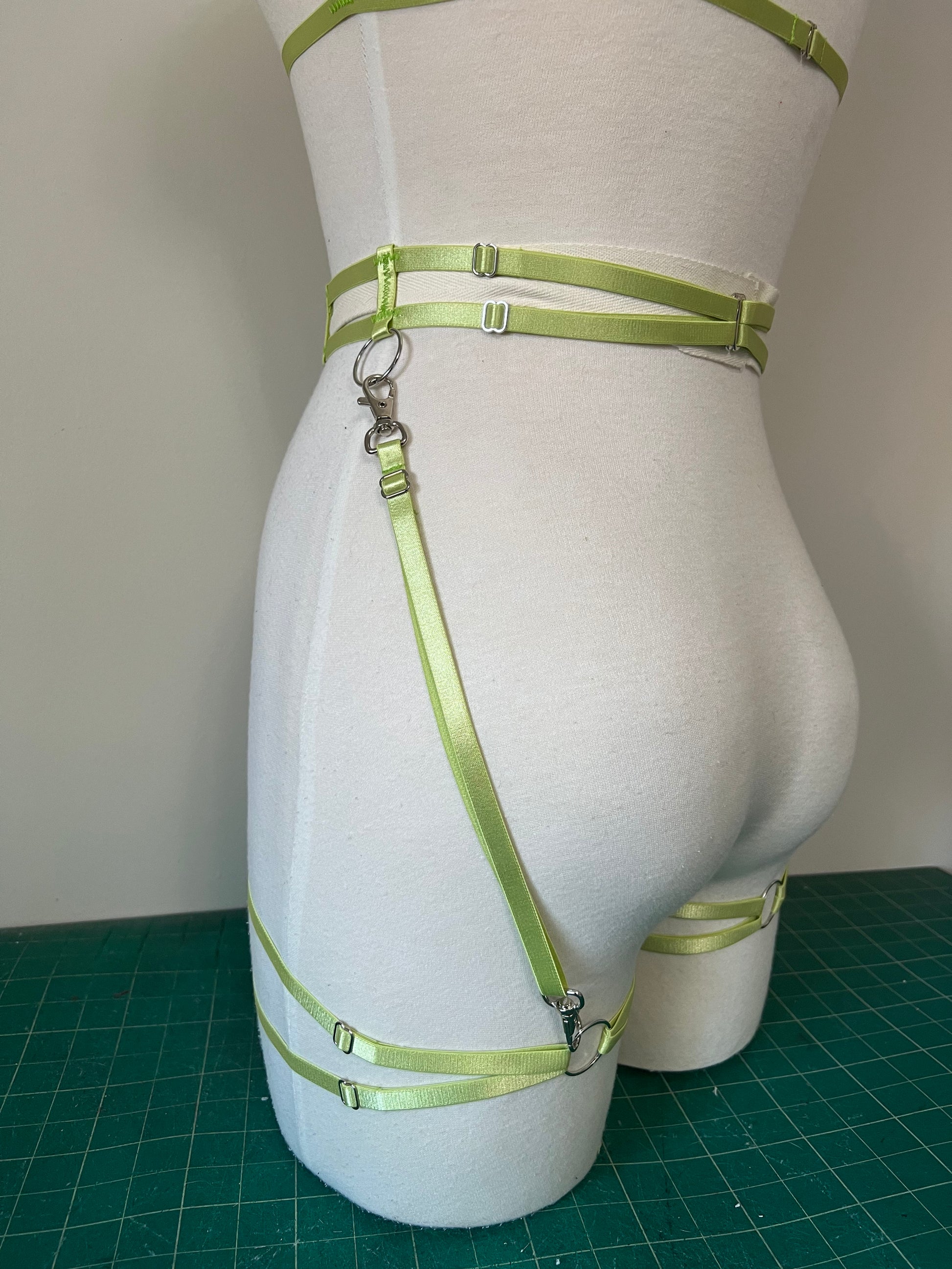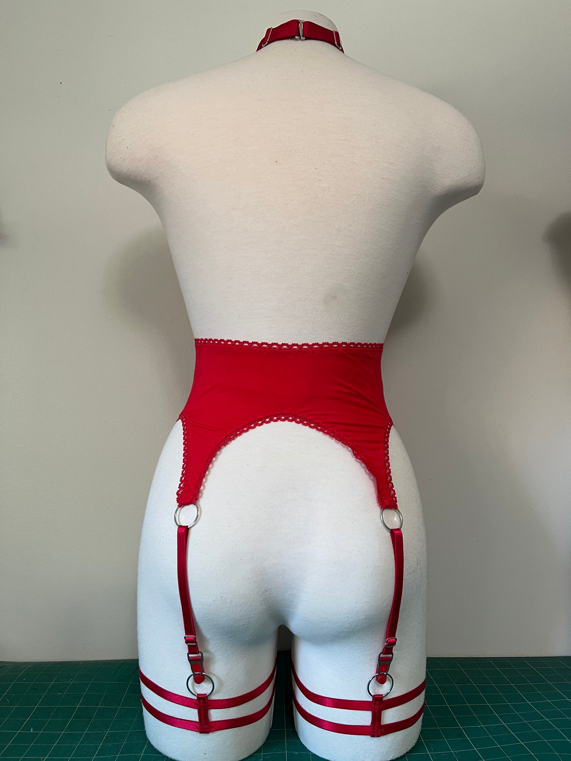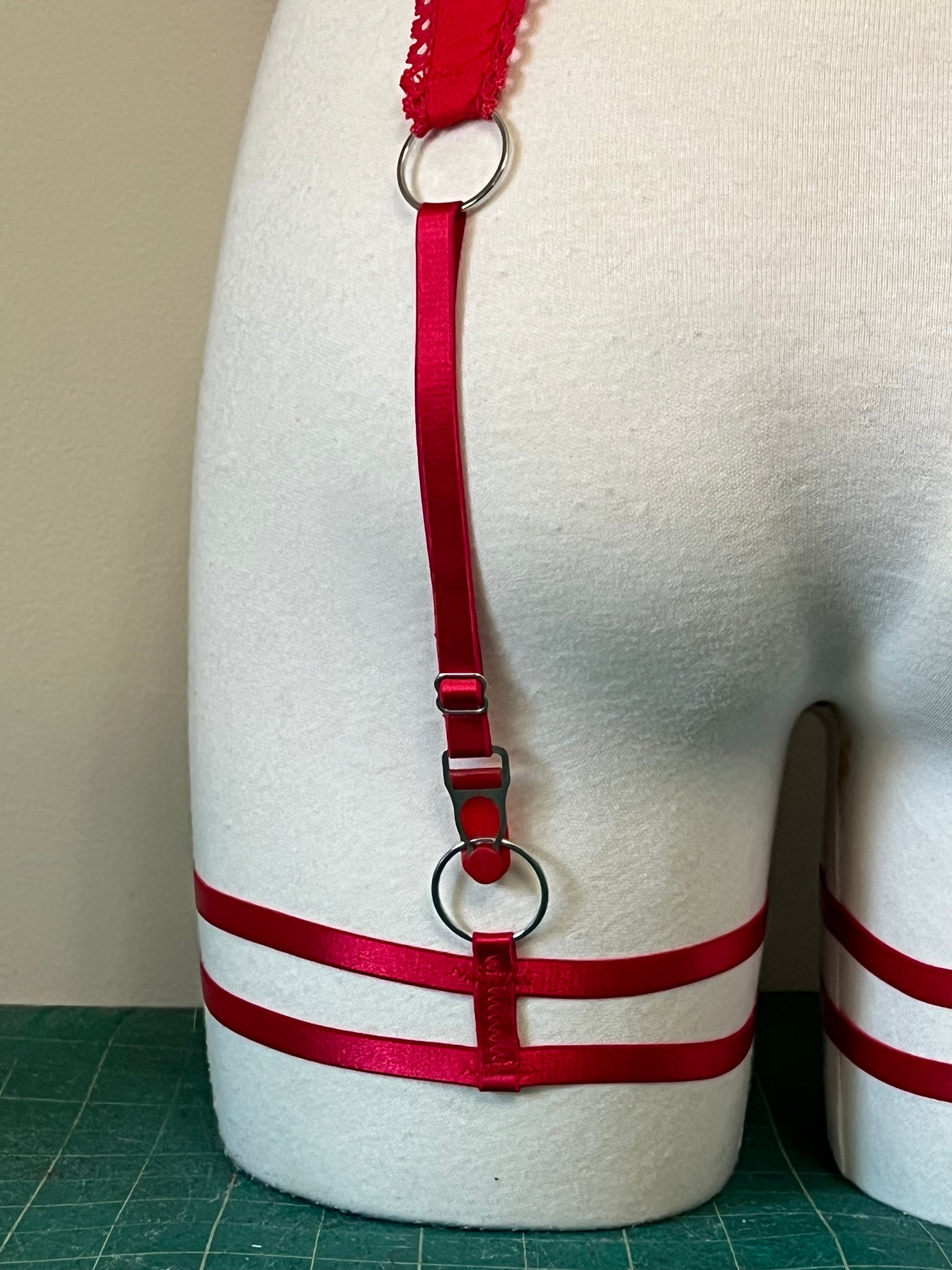 The first born of the new Lara harness range and maybe the most multipurpose! I'd been wanting to make fun, "bondage light" elastic cuffs for years now but never got around to it. I realized there are girls out there who either don't own stockings or don't intent to, but still want to wear styles like the Lilith or Zelda merrywidows that have garter clips. You can technically wear them over stockings for more support, but they look just as sexy on their own. They can also be used like thigh cuffs, and when paired with any of the other cuffs and connector straps in the Lara range they make for the perfect, easy, low commitment bedroom accessories. Offered in eight colors and can be worn in three different ways, as shown in the photo slides. There are two size options but they're always fully adjustable.